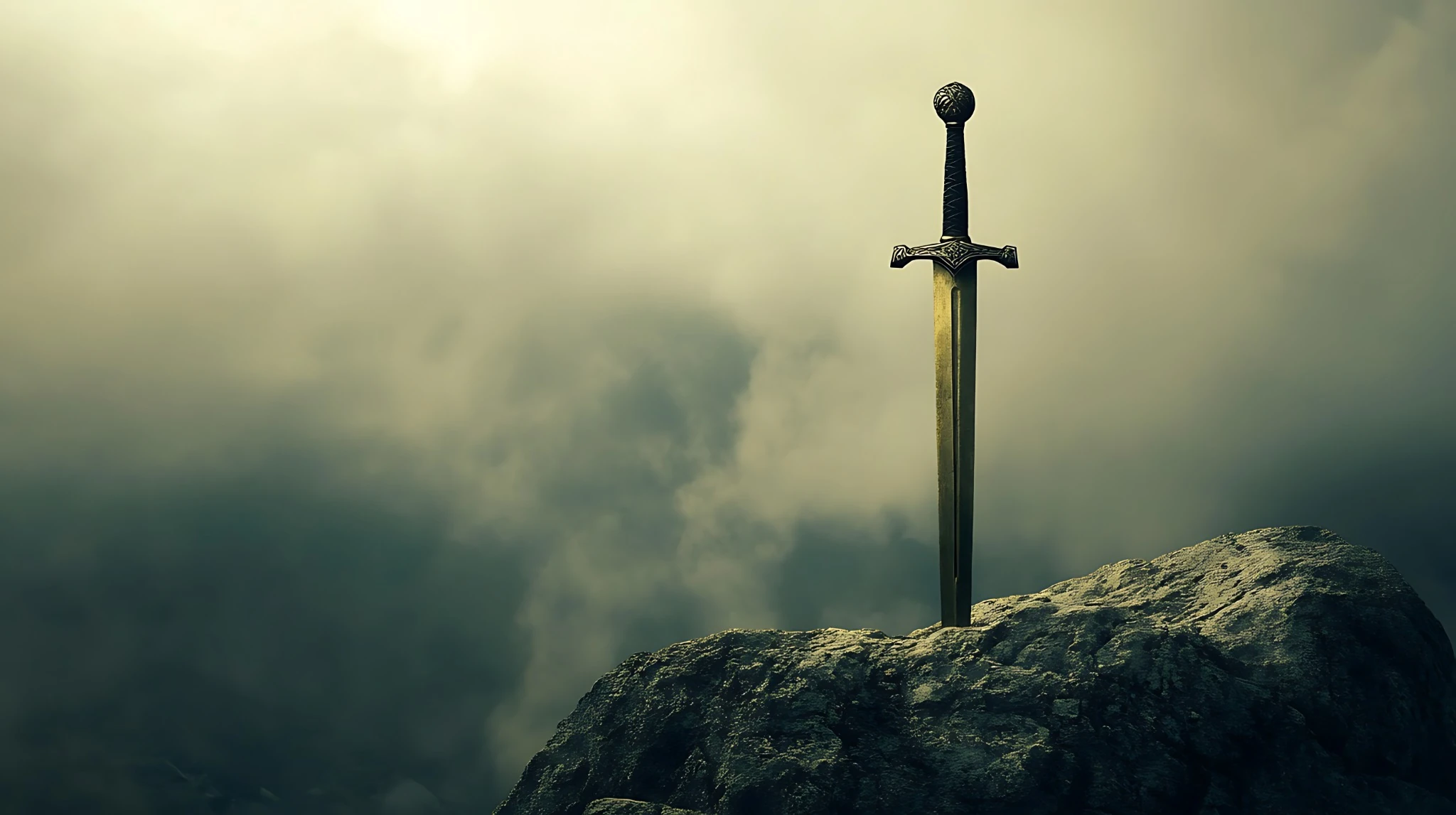 Obraz Króla Mieczy jest obrazem władzy intelektualnej. Siedzi na kamiennym tronie, wysoko, w miejscu, gdzie powietrze jest rzadkie, a widok ostry. Jego postawa jest prosta, pewna, pozbawiona kokieterii. To nie jest władca, który musi się popisywać – jego autorytet jest oczywisty, milczący, nienaruszalny. W prawej ręce trzyma miecz, ostrze skierowane ku niebu, symbol myśli, która przecina wszystko, co niejasne. Lewa dłoń spoczywa na poręczy tronu, a jego postura jest wyprostowana i niewzruszona.