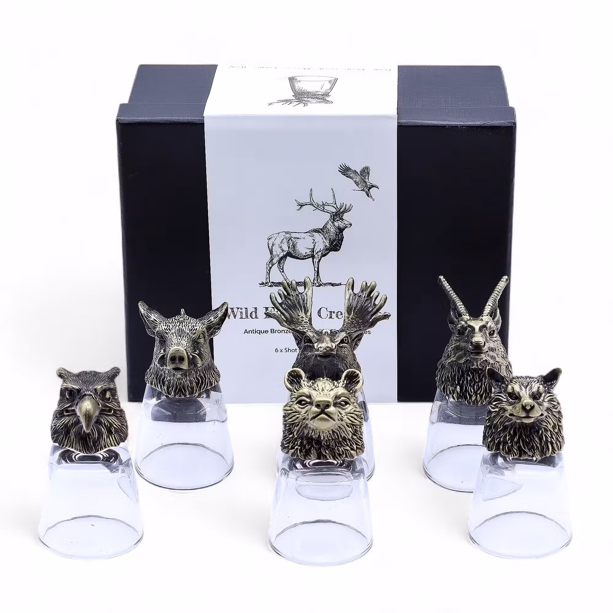 Zestaw sześciu kieliszków Leśne Zwierzęta w antycznym brązie (50 ml) to wyjątkowe połączenie sztuki i funkcjonalności. Każdy kieliszek osadzony jest na rzeźbionej podstawie przedstawiającej zwierzęta lasu – jelenia, niedźwiedzia, orła, kozła, dzika i wilka. Gdy kieliszek zostanie odwrócony, figura zwierzęcia ukazuje się w pełnej formie, tworząc małe dzieło sztuki. Zestaw zamknięty w eleganckim czarnym pudełku stanowi doskonały prezent dla miłośników natury i wyjątkowego rzemiosła.