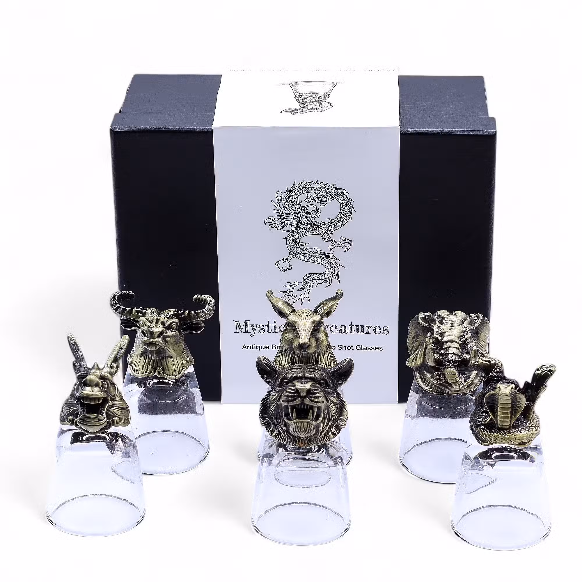 Zestaw kieliszków Mityczne Stworzenia w antycznym brązie (50 ml) to połączenie symboliki, sztuki i precyzyjnego rzemiosła. Każdy kieliszek osadzony jest na metalowej podstawie przedstawiającej legendarne istoty – smoka, tygrysa, kobrę, słonia, kozła i barana. Rzeźbione detale i eleganckie wykończenie sprawiają, że każdy element jest nie tylko naczyniem, ale małym dziełem sztuki. Zestaw zapakowany w czarne pudełko prezentowe będzie wyjątkowym upominkiem dla miłośników mitów i kolekcjonerów niezwykłych przedmiotów.